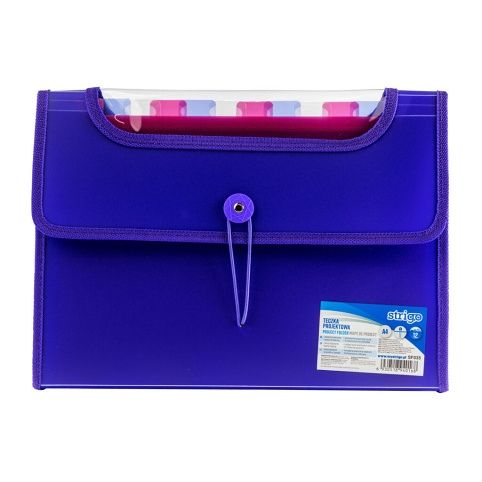 Fialová složka A4 s 12 kapsami / přehrádkami se zapínáním na gumu a knoflík.