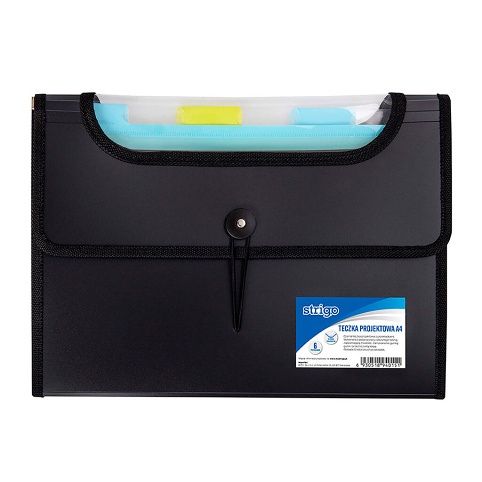 Černá složka A4 s 6 kapsami / přehrádkami se zapínáním na gumu a knoflík.