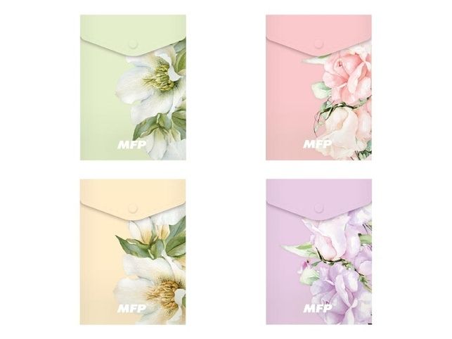 Složka z PolyPropylenu (PP), která se zavírá pomocí druku - velikost A6 s květinovým motivem. Složka slouží jako pomocník pro třídění a ukládání dokumentů, takže je budete mít vždy pohromadě. MATERIÁL: PP SÍLA MATERIÁLU: 0,21 mm BARVA: zelená, růžová, béžová, fialová POTISK: květy Uvedená cena je za 1 ks.