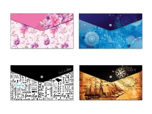 PP složka s drukem o velikosti DL - Složka slouží jako pomocník pro třídění a ukládání dokumentů, takže je budete mít vždy pohromadě. POTISK: modrá - mandaly, růžová - květy, hnědá - loď, černobílá - nápisy SÍLA MATERIÁLU: 0,21mm Uvedená cena je za 1 ks.