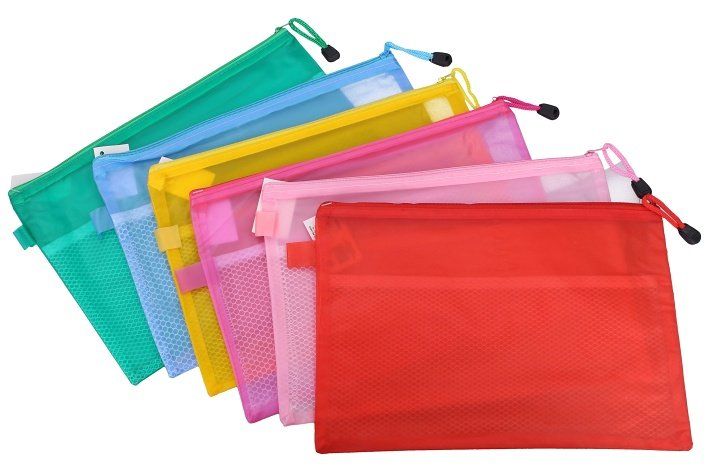 Poloprůhledná složka se síťkou uvnitř. Zapínání na zip. Barevné varianty - sv. růžová, tm. růžová, červená, žlutá, zelená, sv. modrá, tm. modrá