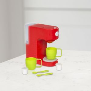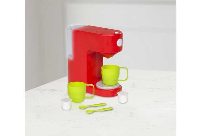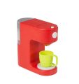 Plastový kávovar pro malou hospodyňku obsahující dva šálky, lžičky, kapsle.