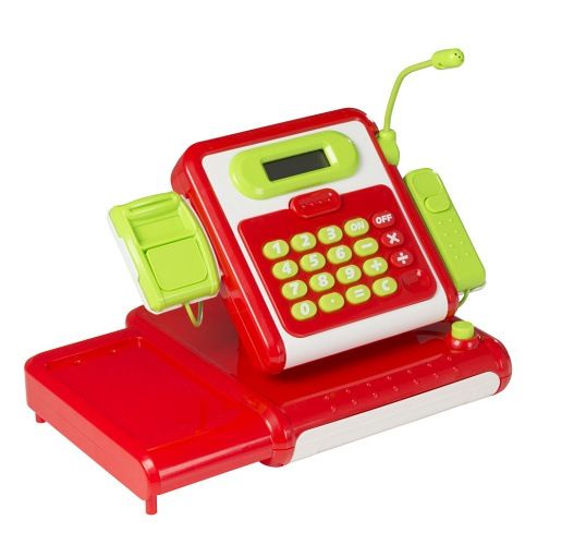 Plastová pokladna určená pro malé prodavačky. Balení obsahuje pokladnu,
