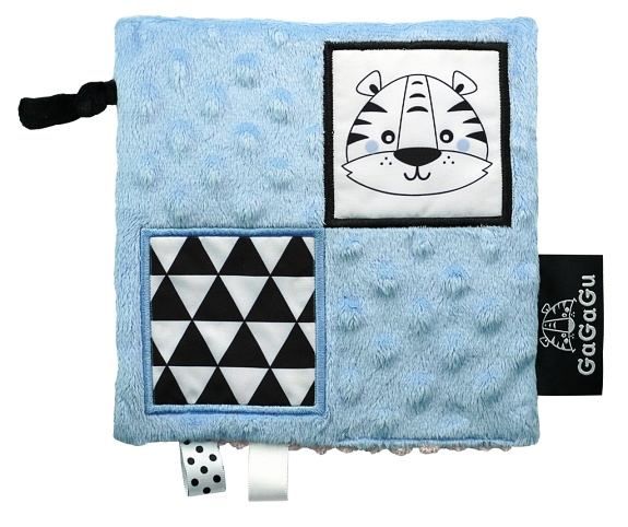 Rozměr: 15×15 cm Každá strana dečky je jiná – textury, šustivé materiály, geometrické vzory, dvě barvy, dvě zvířátka tygr, ovečka.