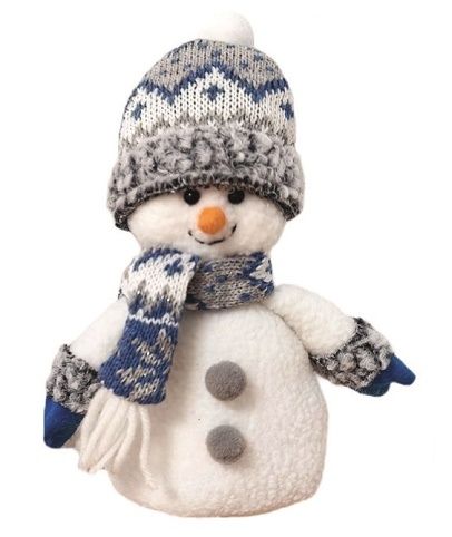 Sněhulák v šedé čepici a s šálou na postavení 19 cm