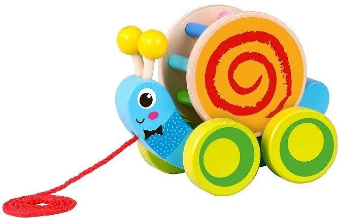 Šnek tahací – dřevěná hračka . Vezmi svého kamaráda na vycházku. Dřevěná tahací hračka ve veselých barvách .12m+