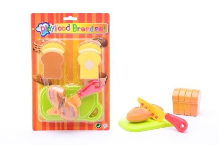 Snídaňová sada obsahuje plastový chléb, rohlík, prkénko a nůž. Vše