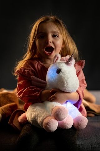 Roztomilý plyšový jednorožec s křídly je vyroben z kvalitní jemné plyše. Tento plyšový kousek je ideálním dárkem! Jednorožec s křídly pomáhá dětem snadněji usnout. Po zmáčknutí tlapky hraje klidnou relaxační hudbu cca 17 minut. Ve tmě svítí a mění barvy.