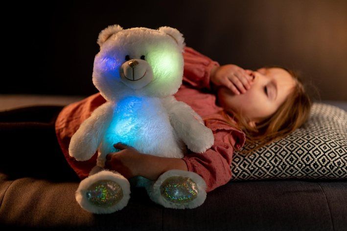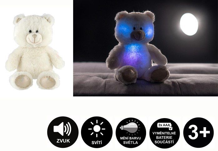 Roztomilý plyšový medvídek je vyroben z kvalitní jemné plyše. Tento plyšový kousek je ideálním dárkem! Medvídek Snílek pomáhá dětem snadněji usnout. Po zmáčknutí tlapky hraje klidnou relaxační hudbu cca 17 minut. Ve tmě svítí a mění barvy.