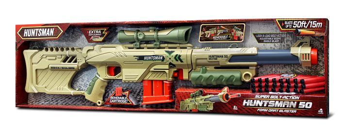 Největší zbraň kolekce Huntsman - Sniper Blaster umožňuje snadno sejmout prodloužení hlavně, pažbu i zaměřovač a proměnit tak tohoto skvěle vypadajícího dalekonosného obra na šikovnou ruční zbraň na pěnové náboje.