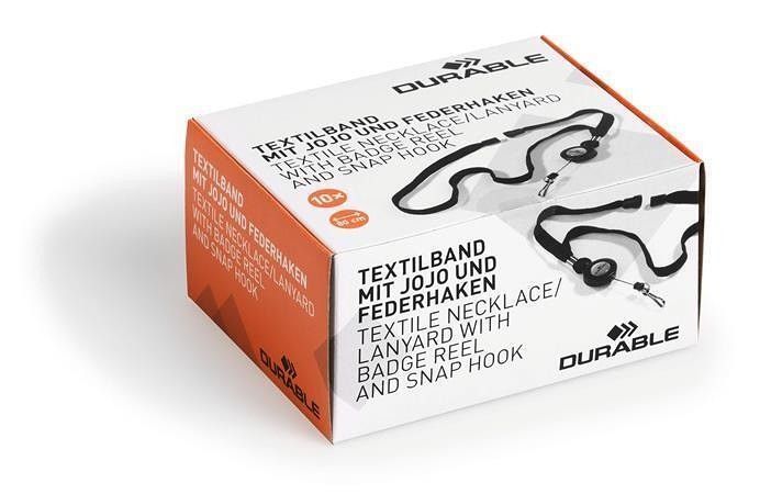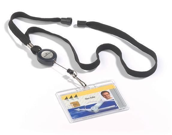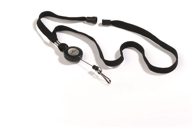 Šňůrka s navíjecím držákem pro snadné uchycení jmenovek, držáku karet. Lze kombinovat s děrovanými jmenovkami DURABLE. Bezpečnostní uvolnění při zachycení šňůrky.