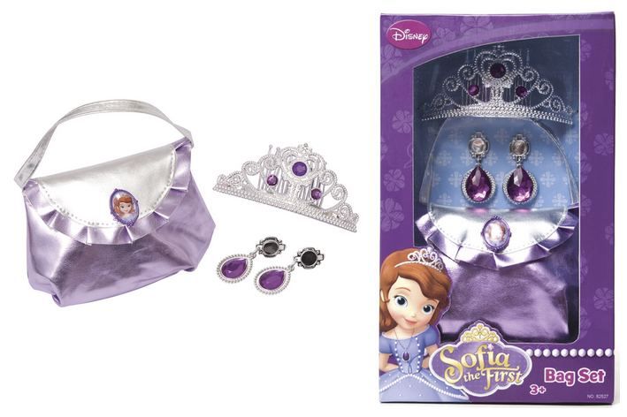 V balení holčička najde krásnou fialkovou kabelku s obrázkem princezny Sofie, stříbrnou korunku s fialovými kameny a náušnice.