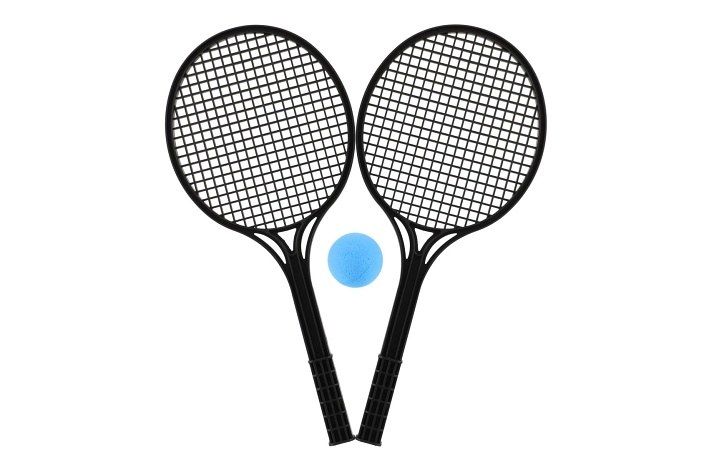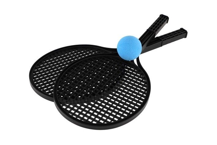 Černé plážové rakety s míčkem na soft tenis. Letní zábava začíná pohybem společně s pálkami na soft tenis.
