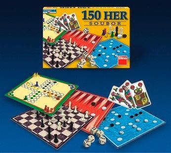 Soubor 150 her. Balení obsahuje 2 herní oboustranné plány, 32 šachových figurek ve 2 barvách, 16 figurek ve 4 barvách, 30 dámových kamenů ve 2 barvách, 6 bodových hracích kostek, 32 jednohlavých mariášových karet, 1 pravidla. Hra je určena pro 2 a více hráčů. Vhodné od 6 let.