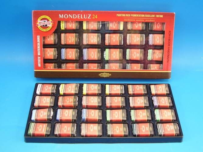 Souprava akvarelových barev uměleckých 24 I.. Akvarelové barvy MONDELUZ jsou transparentní s jasnými odstíny, s velmi malou kryvostí určené pro malování vlasovým štětcem technikou akvarelu. Dodávány jsou pevném stavu ve formě kyvetek z umělé hmoty zabalené v hliníkové fólii označené etiketou. Jejich kvalitativní parametry, týkající se kryvosti, světlostálosti a složení jsou vždy uvedeny na etiketě.