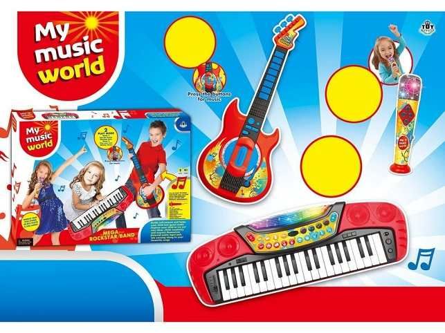 Mega super velká souprava 3 v 1 obsahuje kytaru na baterie + piáno 37 kláves + mikrofon. K mikrofonu je možné připojit externí audio zařízení. Piáno obsahuje zvuky nástrojů, zvuk bicích, taneční doprovodné rytmy, může nahrávat a přehrávat . Napájení piána: 3 x 1,5V AA baterie (nejsou součástí balení ). Napájení mikrofonu: 2 x 1,5V AA baterie (nejsou součástí balení ). Napájení kytary: 3 x 1,5V AA baterie (nejsou součástí balení ). Doporučená věk: 3 +