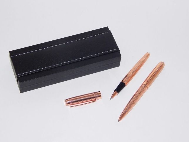 souprava celokovového kuličkového pera a rolleru, otočný mechanismus, vyměnitelná náplň F-Parker, šíře stopy 0,7 mm (kuličkové pero), náplň Ceramic, šíře stopy 0,5 mm (roller), modrý inkoust, luxusní dárková krabička