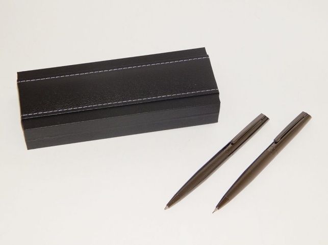 souprava celokovového kuličkového pera a automatické tužky, otočný mechanismus, vyměnitelná náplň F-Parker, modrý inkoust, šíře stopy 0,7 mm (kuličkové pero), tuha 0,5 mm (automatická tužka), luxusní dárková krabička