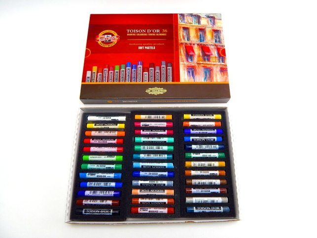 Souprava 36 ks kulatých uměleckých pastelů s ovinem o průměru 10 mm a délce 75 mm. Mají vynikající psací vlastnosti i světlostálost. Při kreslení je možné použít držák pastelů KOH-I-NOOR Versatil. Kresbu doporučujeme po dokončení stabilizovat fixativem.