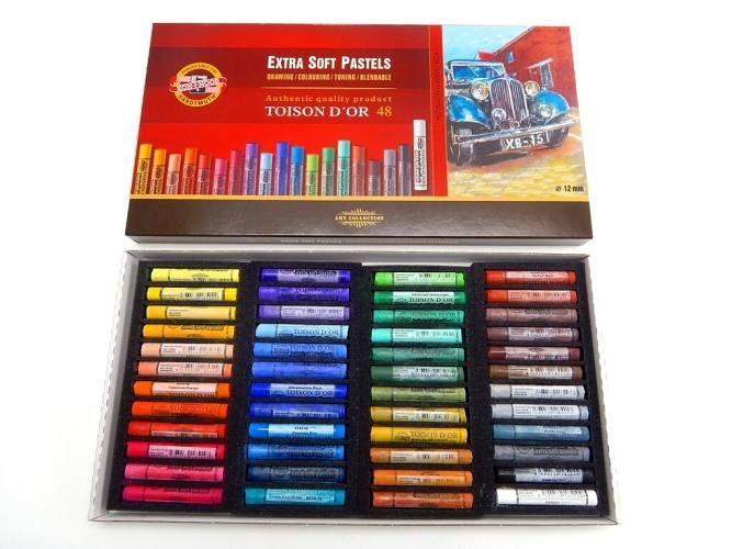 Souprava 48 ks Extra prašných uměleckých pastelů s ovinem, o průměru 12 mm a délky 75 mm. Pastely jsou určeny pro umělecké a hobby kreslení. Vyznačují se vysokou pigmentací a proto mají jasné barvy a vysokou světlostálost. Kresbu doporučujeme ukončit fixativem jako ochranu proti vyprašování a nebo rozmazání.