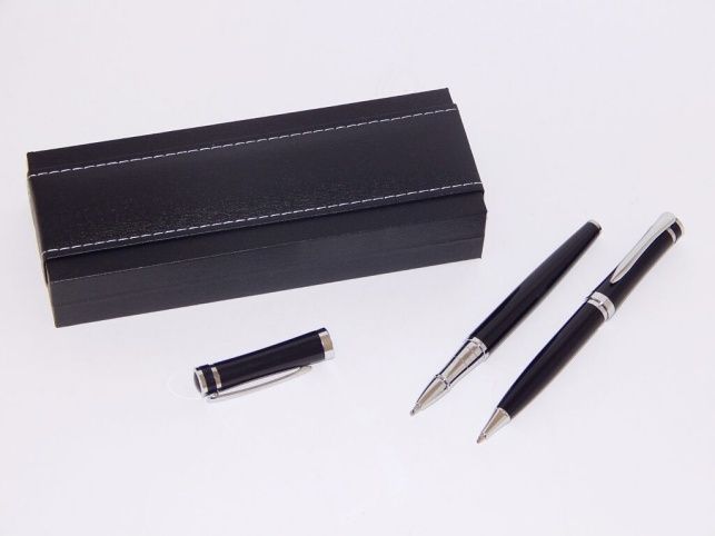 souprava celokovového kuličkového pera a automatické tužky, otočný mechanismus, vyměnitelná náplň F-Parker, modrý inkoust, šíře stopy 0,7 mm (kuličkové pero), tuha 0,5 mm (automatická tužka), luxusní dárková krabička