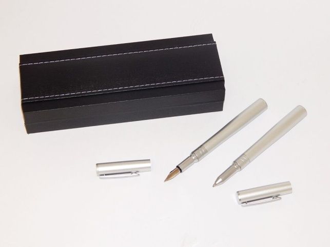 souprava celokovového kuličkového a plnicího pera, kuličkové pero, otočný mechanismus, plnicí pero s víčkem, vyměnitelná náplň F-Parker, šíře stopy 0,7 mm (kuličkové pero), inkoustové bombičky (plnicí pero), modrý inkoust, luxusní dárková krabička