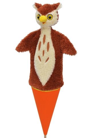 Kornoutový maňásek "3v1" = loutka+maňásek+schránka na drobnosti. Ovládá se dřevěnou tyčkou, kterou také schováte celou postavičku do kornoutu. Otvorem na zádech ovládáte ruce, tak jako u maňásků, nebo vložíte drobné dárky do kornoutu.