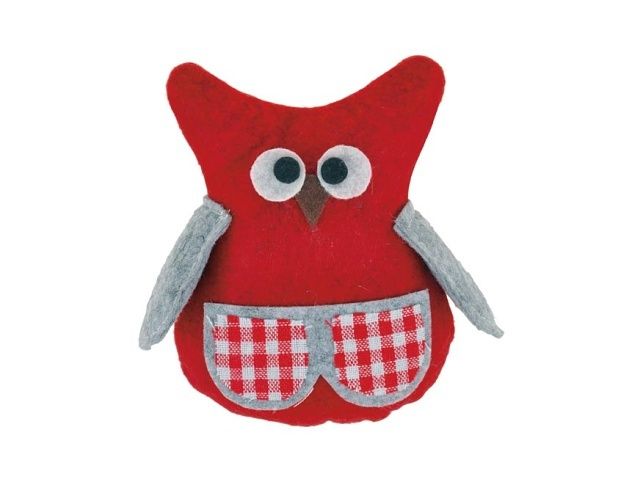 Červenošedá filcová sova s kárem - Sovu použijte jako dekoraci do bytu, případně jej můžou maminky využít jako jehelníček. VAROVÁNÍ: Nevhodné pro děti do 3 let. Nebezpečí vdechnutí a spolknutí malých částic. Uvedená cena je za 1 ks.