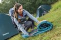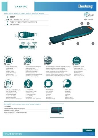 Spací pytel Bestway Ridgepro mumie je určený pro outdoorové nadšence a kempování v chladnějších podmínkách. Jeho rozměry činí 230 cm na délku, 74 cm v nejširší části u hlavy a 48 cm v oblasti nohou, což poskytuje dostatek prostoru pro pohodlný spánek. Tento mumie stylový spací pytel je navržen tak, aby efektivně izoloval teplo a minimalizoval únik tepla díky svému tvaru, který obepíná tělo a má zúžený konec u nohou. Barva spacáku je tmavě zelená s akcenty v odstínu petrolejové a vnitřek je kontrastně oranžový, což zároveň usnadňuje orientaci uvnitř. Materiály použité na výrobu spacáku jsou šetrné k životnímu prostředí, protože vnější tkanina je z recyklovaného polyesteru 210T, zatímco podšívka je z recyklovaného polyesteru ponžé 190T. Výplň tvoří dvě vrstvy recyklovaných vláken s hmotností 150 g/m2, což zajišťuje dostatečnou tepelnou izolaci i při teplotách až do -17 °C (extreme). Komfortní teplota je stanovena na 4 °C, což je ideální pro jarní, podzimní i mírné zimní podmínky. Spací pytel je vybaven dvoucestným zipem, který umožňuje snadné otevírání a zavírání z obou stran, a zároveň je podél zipu umístěna izolační ochrana a ramenní chlopně proti profukování. Další praktickou součástí spacáku je nastavitená kapuce, která chrání hlavu před chladem a větrem. Kapuce je vybavena stahovací šňůrkou s pojistkou, která umožňuje její utahování podle potřeby. Uvnitř spacáku je také kapsa pro uložení drobných osobních předmětů, například telefonu či klíčů. Spací pytel je možné po složení díky textilní smyčce snadno zavěsit nebo uskladnit. Součástí balení je také transportní vak z odolného materiálu, který usnadňuje přenášení a skladování spacáku. Váha celého výrobku je 1,65 kg, což z něj činí lehkou a praktickou volbu pro outdoorové aktivity. Design spacáku je promyšlený nejen z hlediska funkčnosti, ale i estetiky, kde kontrastní vnitřní a vnější barvy vytvářejí příjemný vizuální efekt. Spací pytel je vhodný pro široké spektrum uživatelů, kteří hledají kombinaci tepelné izolace, pohodlí a udržitelnosti v jednom produktu. Díky certifikaci GRS (Global Recycled Standard) je tento výrobek zárukou ekologicky šetrné produkce, která minimalizuje dopad na životní prostředí. Celkově je Bestway Ridgepro mumie spací pytel vhodný pro všechny, kteří chtějí během svých výletů spát v teple a komfortu, a zároveň dbají na ekologickou odpovědnost.