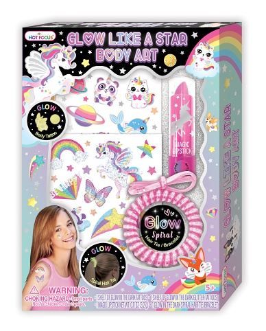 TETOVÁNÍ NA TĚLO (SVÍTÍCÍ VE TMĚ) - sada Obsah: Balzám na rty, gumička do vlasů, arch tetovacích samolepek, arch třpytivých tetovacích samolepek Návod: Nanesení tetování (postupuj podle obrázků na obalu a v original návodu) 1. Před aplikací by