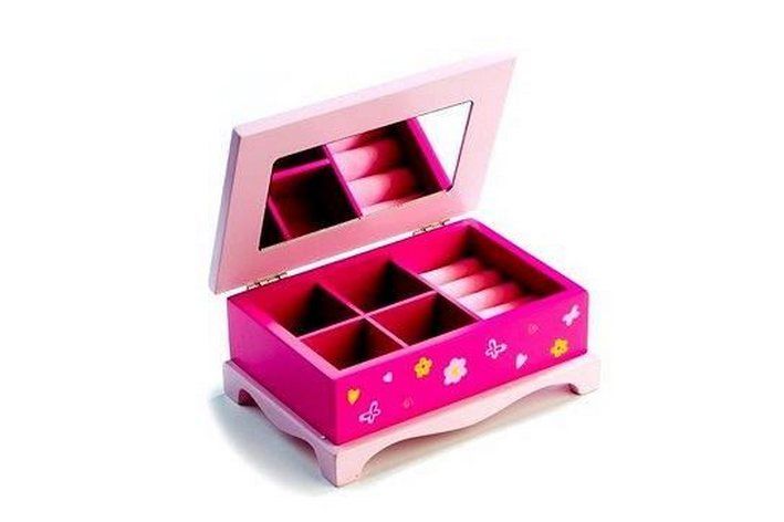 Každá malá parádnice musí mít svoji šprkovnici. Tato dřevěná šperkovnice obsahuje příčné přehrádky, takže do ní lze snadno srovnat všechny šperky. Na spodní starně víka na zrcadlo. Šperkovnička má růžovou barvu. Velikost šperkovnice je 17 x 7 x 11 cm