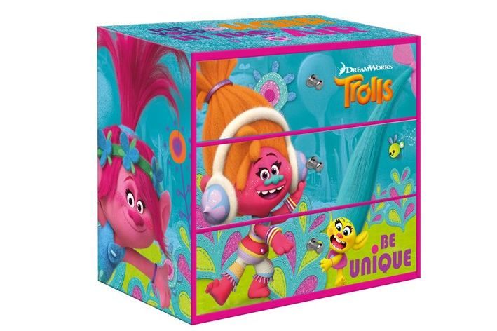 Šperkovnice o rozměrech: délka 14 cm, šířka 9 cm, výška. 12 cm s 3 přihrádkami. Každá přihrádka o rozměru: délka 13,5 cm, šířka 8,5 cm, výška 3,5 cm ukončena kovovým otevíráním. Šperkovnice je vyrobena z kartónu a potištěna postavičkami Trollů. Vnitřní část šperkovnice je růžová.