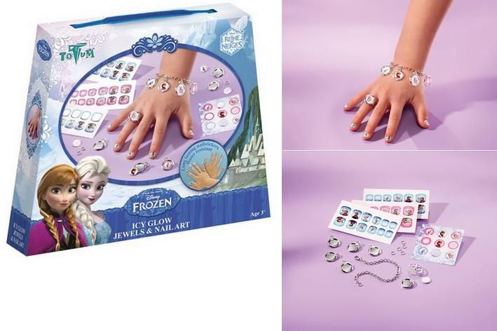 Sada k výrobě náramku s přívěsky a prstýnku s motivy Ledové království a dekorací na nehty, pro malé princezny. Doporučeno pro děti od 3 let.