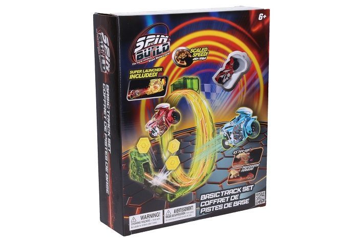 Spin and Build Basic dráha s 1 motorkou. S vystřelovacím zařízením. Dojezd motorky 50 m, na setrvačník s gyroskopem. Velikost motorky 4,5 cm. Další motorky lze zakoupit samostatně (W037920, W037921).
