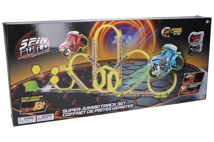 Spin and Build Super dráha s 2 motorkami. S vystřelovacím zařízením. Dojezd motorky 50 m, na setrvačník s gyroskopem. Velikost motorky 4,5 cm. Další motorky lze zakoupit samostatně (W037920, W037921).