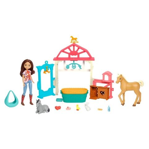 Staňte se součástí přátelství, odvahy a dobrodružství s animovaným filmem společnosti DreamWorks Divoký Spirit! Herní set Lucky je ideální na ošetřovací a pečující hry! Set obsahuje panenku Lucky (18 cm) a několik hracích ploch pro péči o zvířátka, 4 figurky zvířátek a pamlsky na krmení. Hrací plochy zahrnují váhu na vážení mláďátek (váha se opravdu pohybuje), kolébku, díky níž můžete houpat zvířátka (s kolotočem nad hlavou), a pracovní stůl. Hrajte si s tímto barevným herním setem na zábavné příběhy! Barvy a vzhled výrobku se mohou lišit. Panenka neumí samostatně stát. Skvělý dárek pro děti od 3 let.