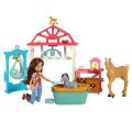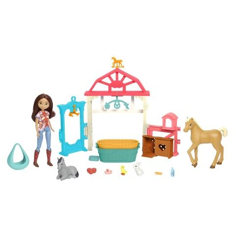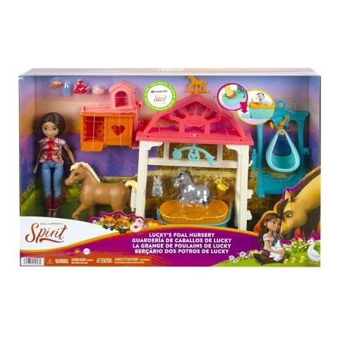 Staňte se součástí přátelství, odvahy a dobrodružství s animovaným filmem společnosti DreamWorks Divoký Spirit! Herní set Lucky je ideální na ošetřovací a pečující hry! Set obsahuje panenku Lucky (18 cm) a několik hracích ploch pro péči o zvířátka, 4 figurky zvířátek a pamlsky na krmení. Hrací plochy zahrnují váhu na vážení mláďátek (váha se opravdu pohybuje), kolébku, díky níž můžete houpat zvířátka (s kolotočem nad hlavou), a pracovní stůl. Hrajte si s tímto barevným herním setem na zábavné příběhy! Barvy a vzhled výrobku se mohou lišit. Panenka neumí samostatně stát. Skvělý dárek pro děti od 3 let.