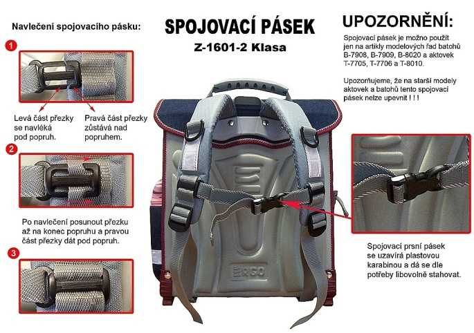 UPOZORNĚNÍ: Spojovací pásek je možno použít jen na artikly modelových řad batohů B-7908, B-7909, B-8020 a aktovek T-7705, T-7706 a T-8010 . Upozorňujeme, že na starší modely aktovek a batohů tento spojovací pásek nejde upevnit!