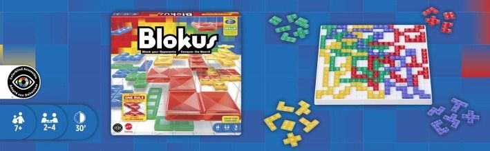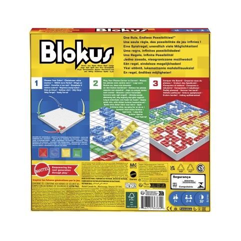 Pravidla strategické hry Blokus™ se naučíte za méně než minutu, ale čeká vás nekonečné množství výzev a zábavy pro celou rodinu. Každý hráč má 21 dílků své barvy a střídavě je pokládá na herní plán. Jediným pravidlem je, že se každý nový dílek musí dotýkat jiného stejné barvy – ale pouze rohem! Cílem je umístit co nejvíce dílků. Hra končí, když už není kam hrát, a vítězí ten, komu zbývá nejméně nepoužitých dílků. Barvy a vzhled karet se mohou lišit.