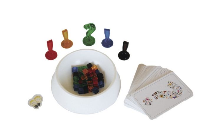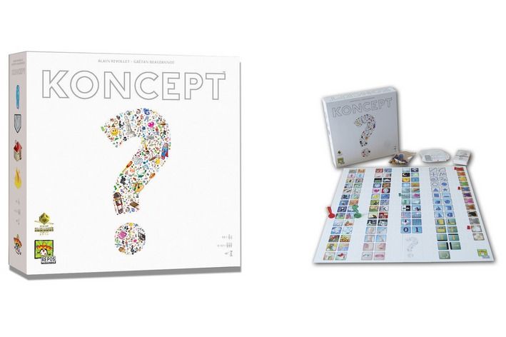 (velký symbol otazníku a 10 kostiček); • 4 sady (modrá, červená, žlutá, černá) pro pomocné koncepty (symbol vykřičníku a 8 kostiček). • 110 karet konceptů, každá s 9 slovy/frázemi ve třech obtížnostech – lehké, těžké a výzva. • Jednoduché a dvojité žetony vítězných bodů (dvojitý žeton má hodnotu 2 bodů, jednoduchý pouze 1 bodu).