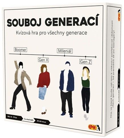 Jedinečná kvízová hra pro dva a více hráčů, která prověří vaše znalosti z různých oblastí lidského života. Není to tak jednoduché, otázky se týkají jak významných událostí, kultury nebo také světa reklamy, módy a různých trendů za posledních skoro sto let. Otázky jsou rozdělené do čtyř časových skupin – Boomer, generace X, mileniálové, generace Z. Hráči mohou hrát samostatně nebo v týmech. Pozor na karty Výzva, kde jde o prověření důvtipu a schopností. Generace nebojují proti sobě, „bojují“ proti sobě jednotlivá časová období. Hráči: 2 a více. Doba hraní: 20 – 60 minut. Pouze pro český trh. Pro děti od 10 let.