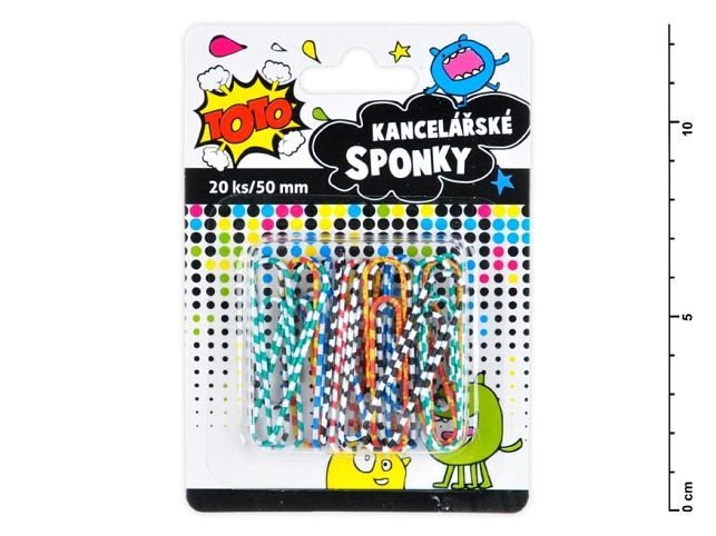 Spona kanselářská pruh. 20ks/50mm - ideální pomocník pro spínání papírů a dokumentů, který nesmí chybět v žádném kancelářském šuplíku! Sponky jsou pruhované, v různých barvách, Uvedená cena je za 1 balení.