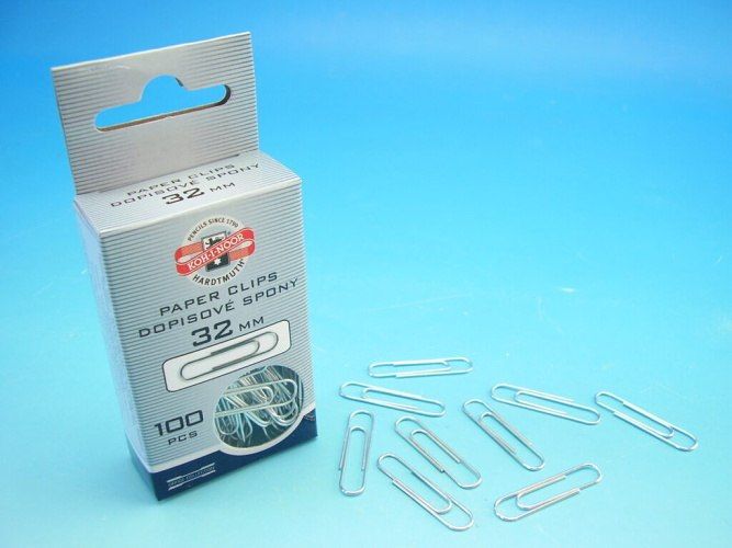 Dopisové spony 32 mm, průměr drátu 1,60 mm, délka 32 mm, šířka 6 mm. Drát je z pokoveného zinku. 150 ks spon je uloženo v papírové krabičce. Spony se používají např. na sepnutí více kusů papírů.