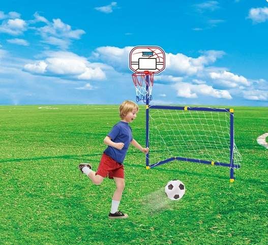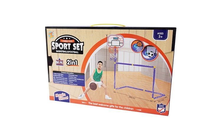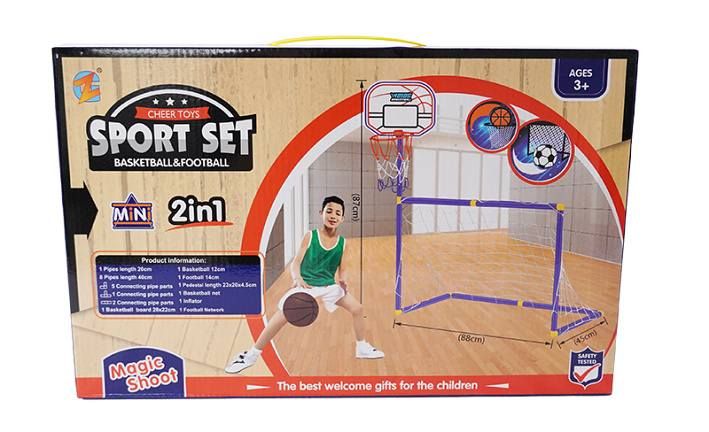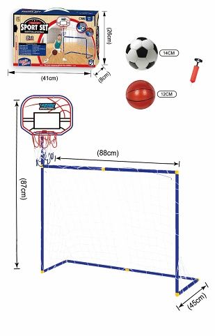 Fotbal nebo basketbal? Sada, která obsahuje náčiní pro obě hry. Vyber si, co si chceš zahrát. Rozměr branky 55x88xx45 cm, výška koše 87 cm, průměr míče na fotbal 14 cm a průměr míče na basketbal 12 cm. V sadě je pumpička na nafouknutí míčků.