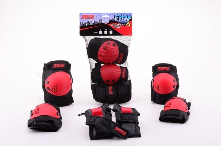 Sportovní chrániče pro kluky velikost S, M a L. Obsahuje hrániče nakolena, lokty a dlaně. Černo -červená.