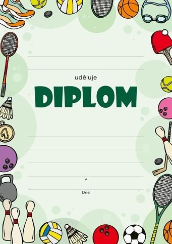 Máte ve třídě nějakého nadaného sportovce? Tak to mu určitě uděláte radost tímto diplomem. Najdete na něm krásně barevné sportovní motivy a naznačené linky pro vyplnění všech důležitých údajů.
