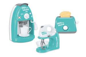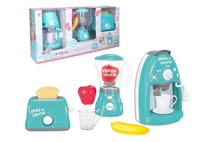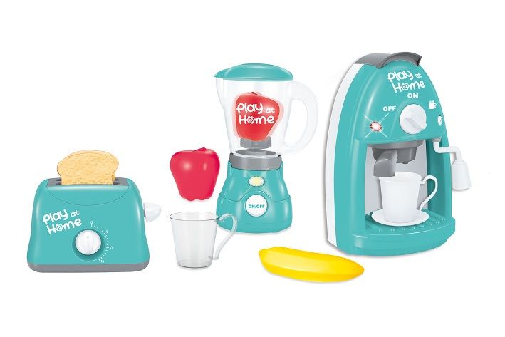 Spotřebiče s efekty 3 ks. Kávovar 22 cm, mixér 20 cm, topinkovač 17 cm. Kávovar - světelné a zvukové efekty, mixér - světelné efekty. Topinkovač s mechanickými efekty. Kávovar - 2xAA, mixér - 2xAA jsou součástí balení.