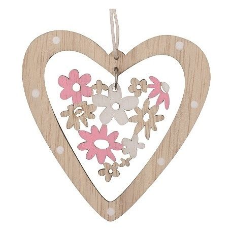 Srdíčko dřevěné s růžovými květy na zavěšení 7,5 cm