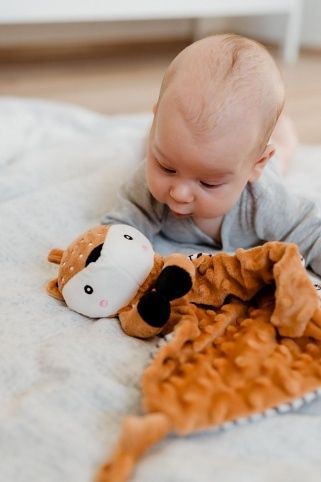 Roztomilý plyšový usínáček ve tvaru srnečka je ideálním společníkem pro nejmenší miminka již od narození. Měkoučká látka typu minky s 3D puntíky poskytuje příjemný dotek, který miminko uklidňuje a podporuje jeho smyslový rozvoj.