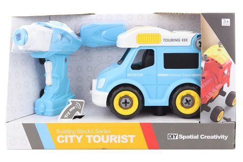 Šroubovací karavan na dálkové ovládání. Karavan lze sešroubovat pomocí přiloženého šroubováku nebo vrtačky. Z vrtačky lze vyndat motorek, který se vloží do karavanu a ten poté jezdí pomocí ovládání dopředu a dozadu. karavan také vydává zvuky. Napájení na 4 AA baterie (nejsou součástí) a na 3 AG13 baterie (jsou součástí). Rozměry karavanu cca 18 x 13,5 x 8,5 cm. Rozměry balení cca 33,5 x 19,5 x 13,5 cm. Věk 3+